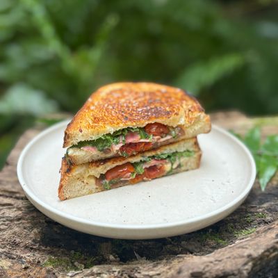 Leg Ham, rocket, sun-dried tomatoes, caramelized onions & Jarlsberg cheese, toasted on sourdough bread