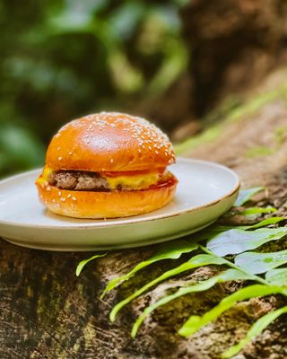 1 beef patty, melted cheese, tomato sauce, on a toasted milk bun.