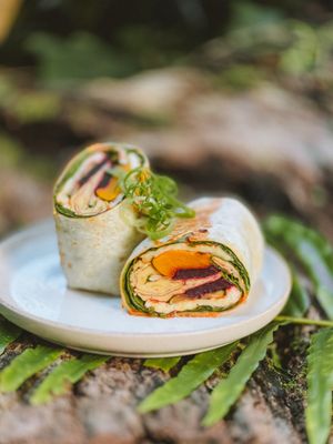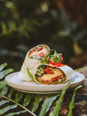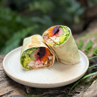 Halloumi, scrambled egg, roast pumpkin, chargrilled zucchini, beetroot & spinach, toasted on a tortilla wrap with House relish.