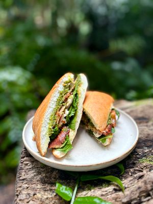 Grilled Chicken, Bacon, Spinach, Pesto & Kewpie mayo, on toasted rustic italian roll.