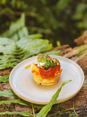 Oven baked muffin with bacon, egg, confit tomato, spinach & cheese, topped with Caramelized onion, whipped feta & served with house relish.
