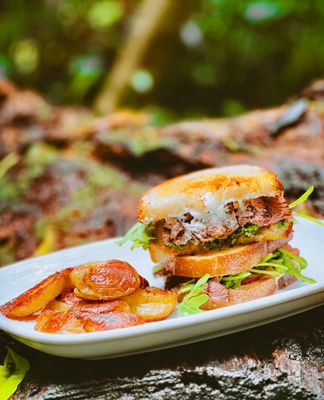 Sliced rump steak on toasted sourdough, with rocket, house relish, kewpie mayo, caramelized onion, smoked feta & a side of roasted confit garlic potatoes.