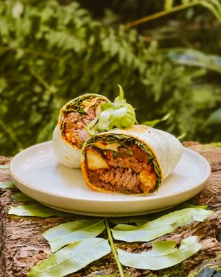Grilled Moroccan chicken, rocket, spiced cous cous, charred zucchini, beetroot, toasted on a tortilla wrap with a zesty yoghurt dressing