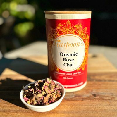 100% Organic, Caffinated Loose Leaf Black Tea, Ginger Root, Cardamon Pods, Star Anise, Cloves, Cinnamon, Peppercorns, Fennel Seeds and Rose.
