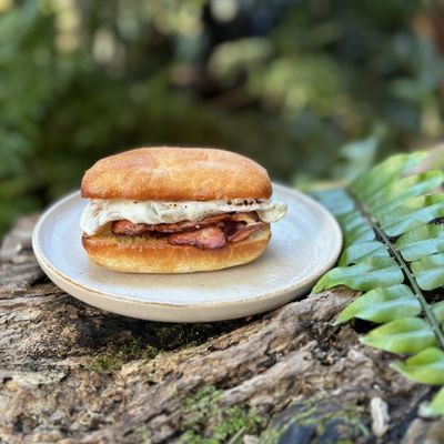 1 fried egg, 1 rasher of bacon on a toasted rustic Italian roll With your choice of BBQ, Tomato or Kewpie Mayo